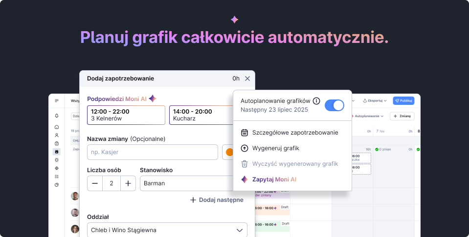 Czy zdarzyło Ci się kiedyś pomyśleć: „Gdyby tylko ktoś mógł zrobić to wszystko za mnie…” Mamy dobrą wiadomość – Twój nowy Asystent AI właśnie to za Ciebie zrobi. Moni AI to pierwszy na rynku wirtualny asystent, który: Odpowiada na pytania o Twój zespół Pomaga Ci stworzyć grafik pracy Przeszukuje dla Ciebie bazę wiedzy Dodaje za Ciebie pracowników i zespoły – nawet ze zdjęcia kartki Asystent odpowie na Twoje pytania, przeanalizuje dane i skróci godziny Twojej pracy od kilku godzin do