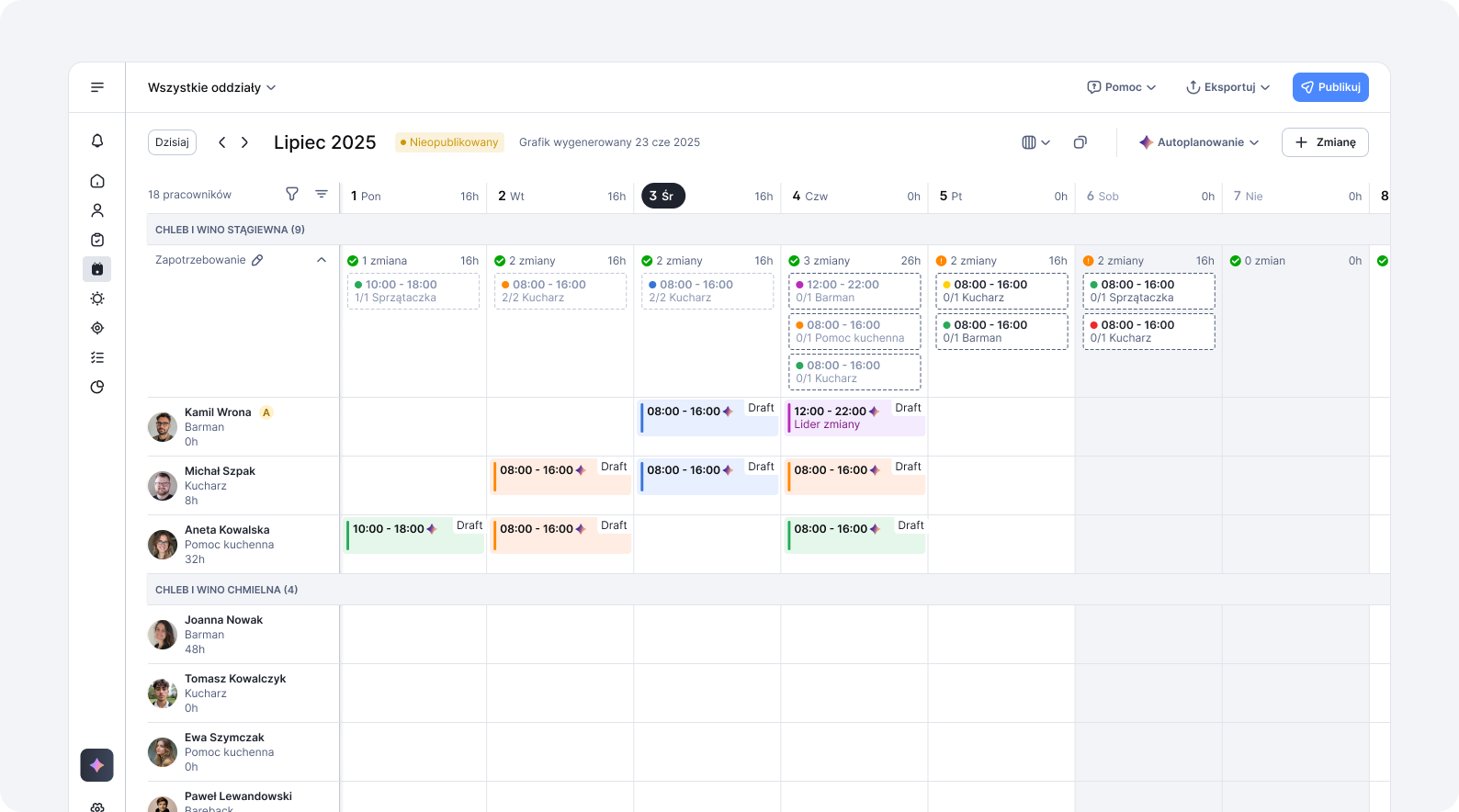 Planujesz tak samo, jak dotychczas w grafiku – wybierasz stanowisko, godziny i ile osób potrzebuje. Tylko tym razem to nie Ty musisz myśleć, kto będzie pracował. System wie, kto jest dostępny, kto ma odpowiednie uprawnienia i kto nie przekroczy limitu godzin.